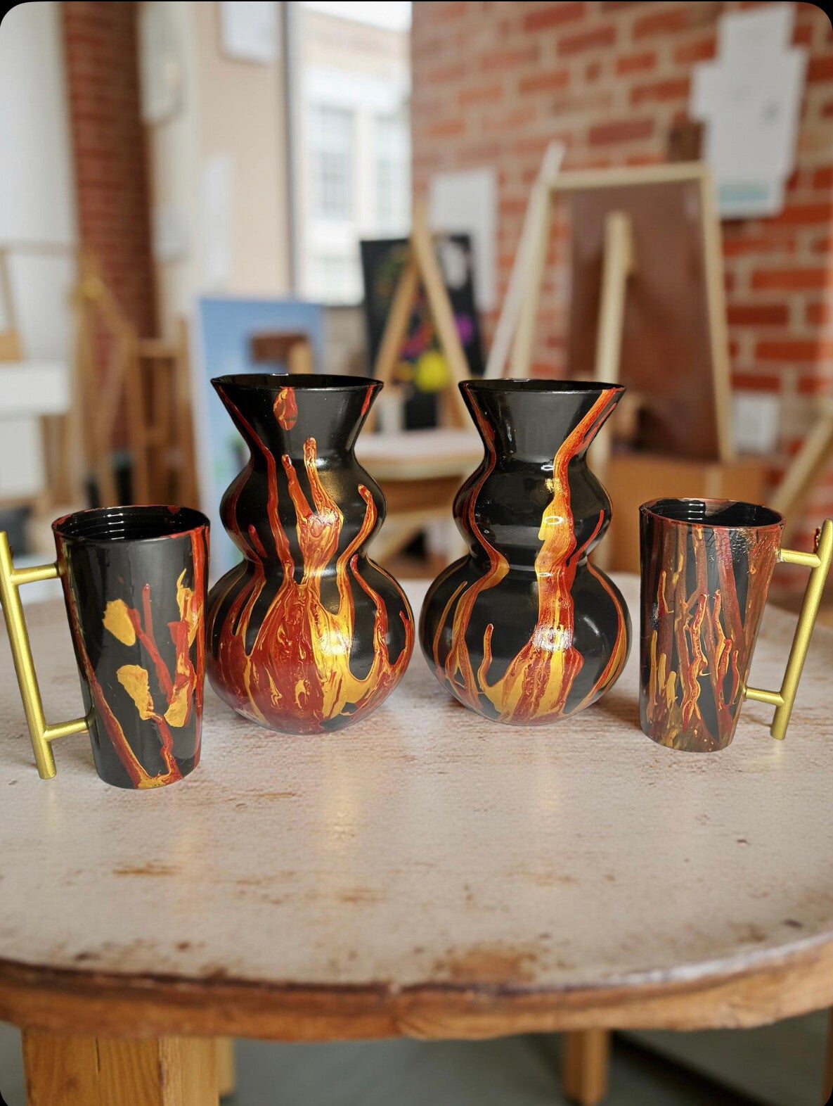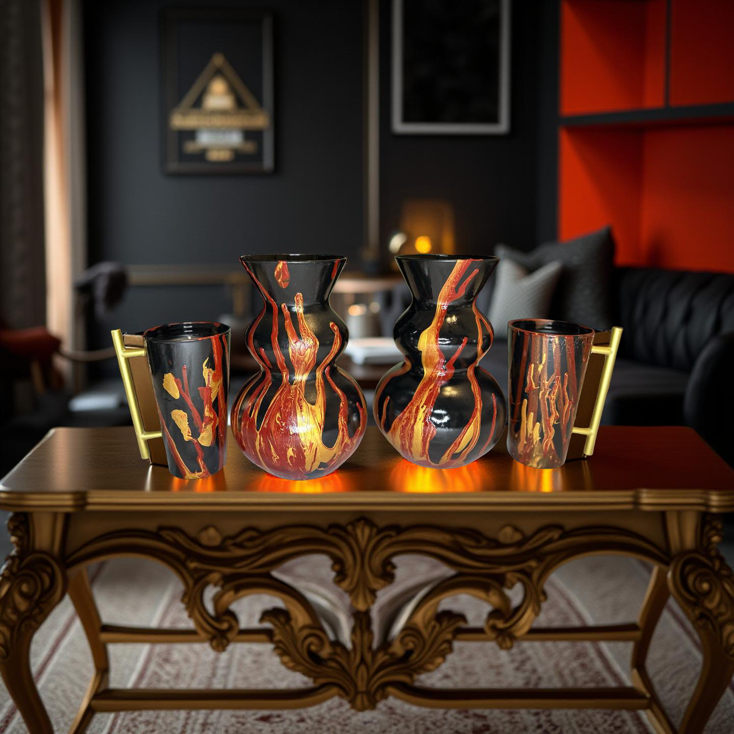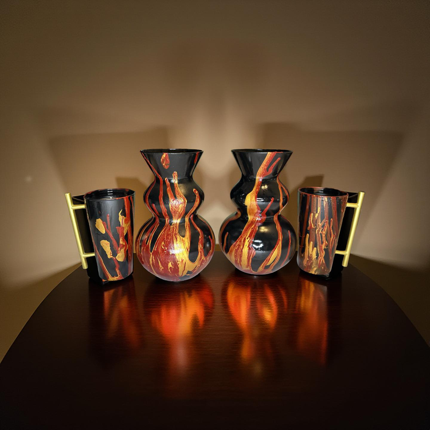 The Fire Flames Candle set (black) is hand poured with unique paint directing skills that creates a flame effect with paints . The apple pumpkin aroma fills any room and smells delicious . Made with soy wax and scented oils, The fire flames set is a perfect gift .